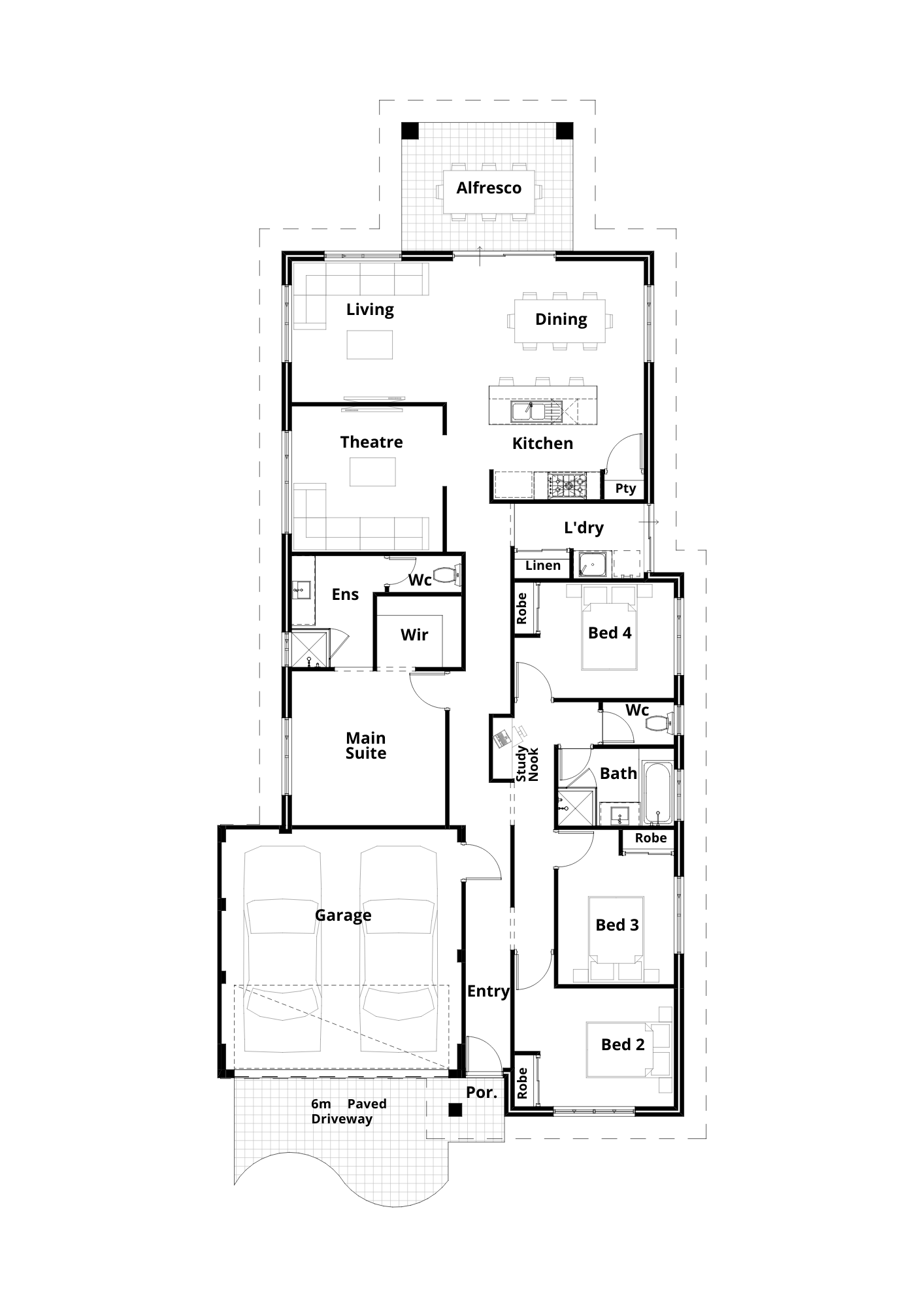 Believe is an elegant 4 bedroom family home, with 2 bathroom, 2 garage. A home theatre at the center, an open living space, with kitchen and dining. Enjoy a covered alfresco at the rear, with a well appointed master bedroom at the front of the house.