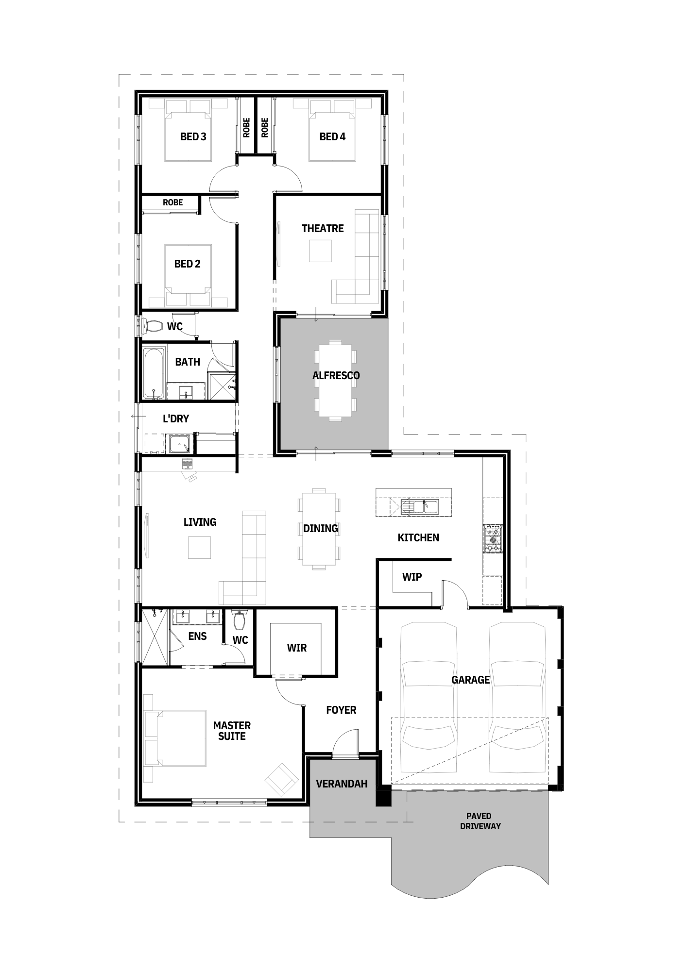 Gaze is a humble 4 bedroom family home, with 2 bathroom, 2 garage. A home theatre, an open living space, with dining and kitchen plus walk in pantry. Enjoy a covered alfresco at the center facing the dining, with a well appointed master bedroom at the front of the house.