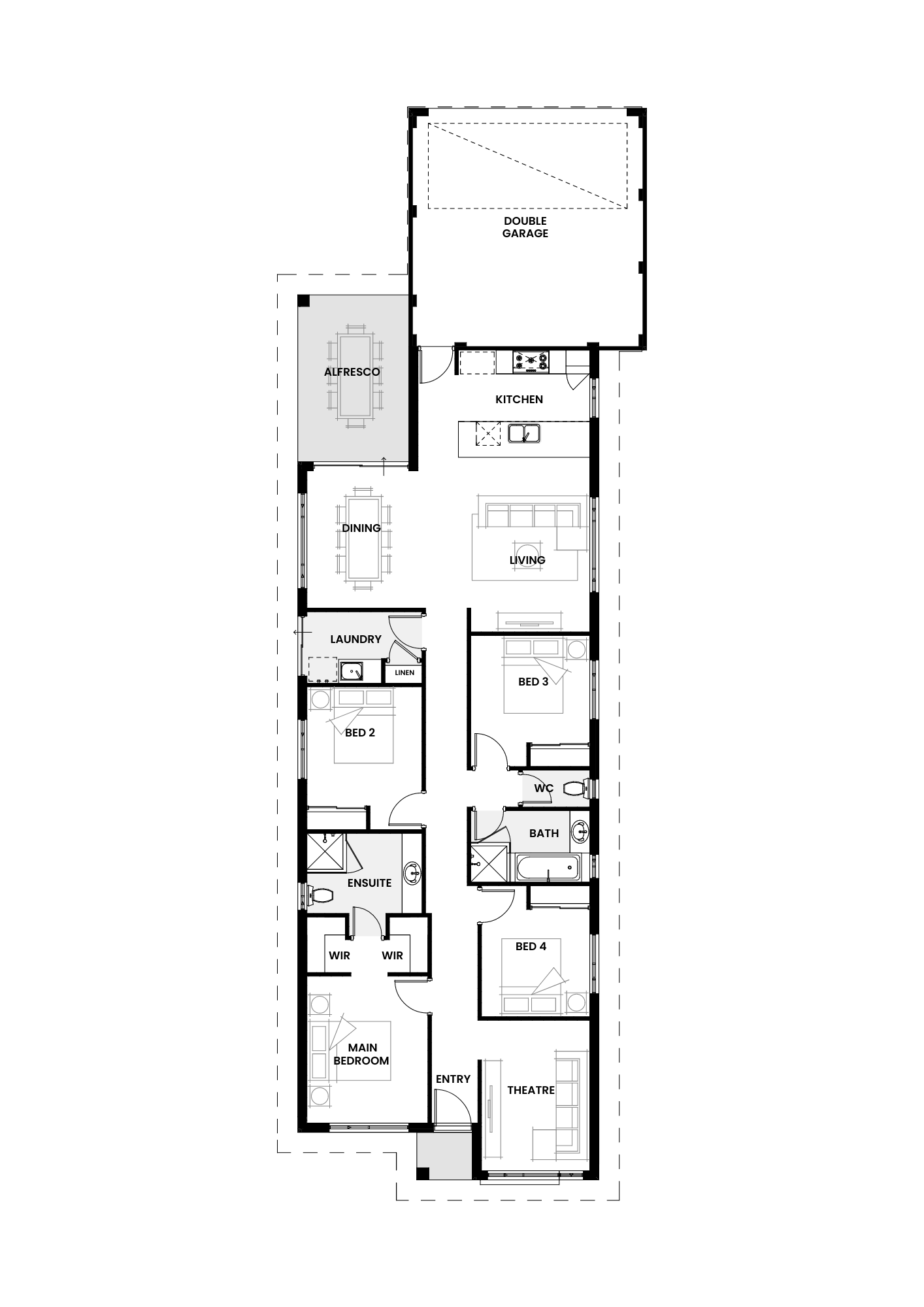 Willow is a humble 4 bedroom family home with narrow allotments, with 2 bathroom, 2 garage. A well-appointed master bedroom and theatre at the front. Enjoy the covered alfresco facing the dining next to an open living space, with kitchen all located at the rear.